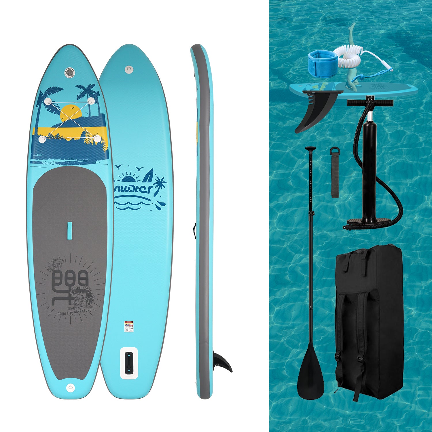The paddle board is made from premium, military-grade PVC with drop-stitch construction, ensuring it is durable, lightweight, and resistant to punctures. This material ensures the paddle board is sturdy while remaining easy to transport.