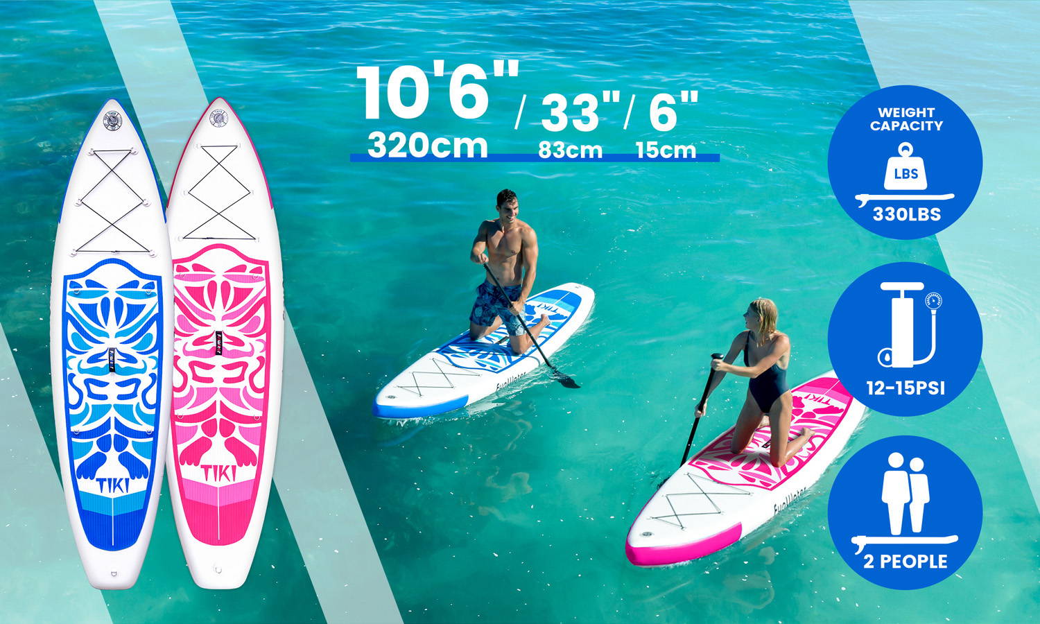The FunWater Tiki 10'6" Inflatable Paddle Board offers stability and performance for all skill levels. Perfect for relaxing rides, paddleboard yoga, or catching small waves, it’s lightweight, durable, and easy to transport, making it ideal for any water adventure.