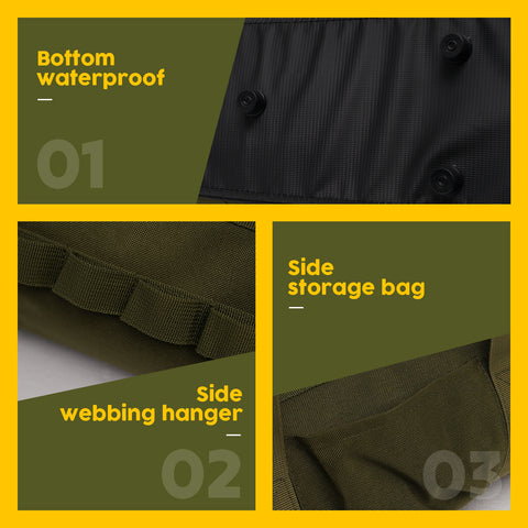 Our Camping Tool Handbag is designed for ultimate convenience and functionality. The waterproof bottom keeps your gear dry on damp surfaces, while the side webbing hanger allows you to attach additional items. Plus, the side storage bag offers extra organization for quick-access tools.