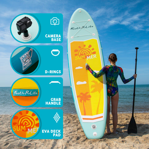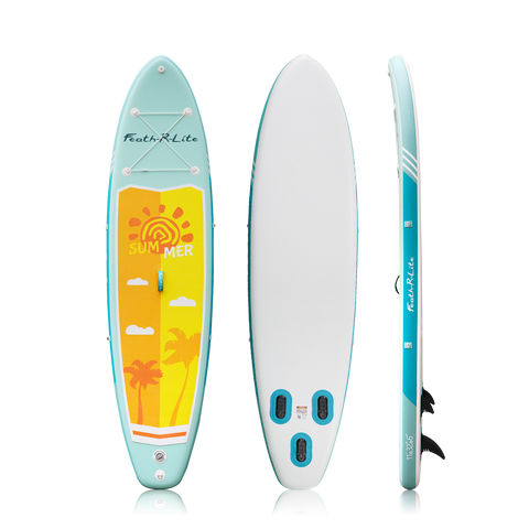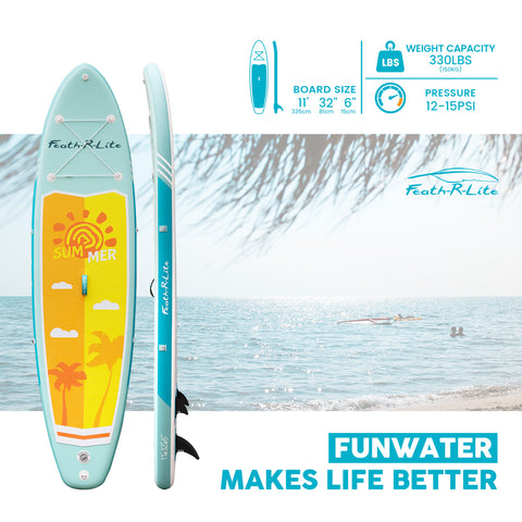The Funwater Paddle Board Summer 11'*32"*6" is a military-grade PVC board with a non-slip EVA deck pad, suitable for all skill levels. Portable and lightweight.