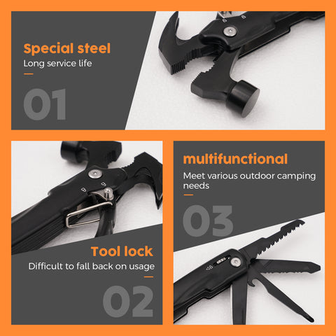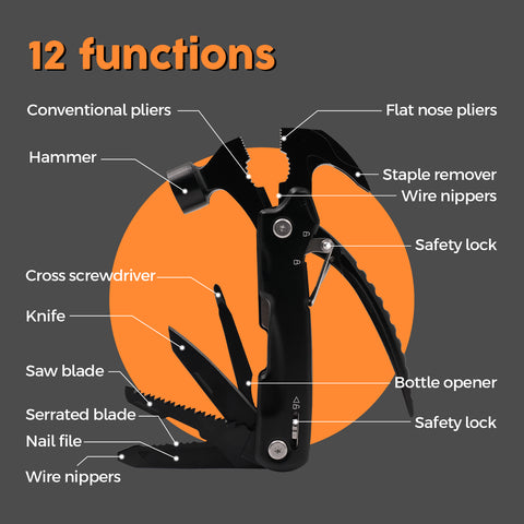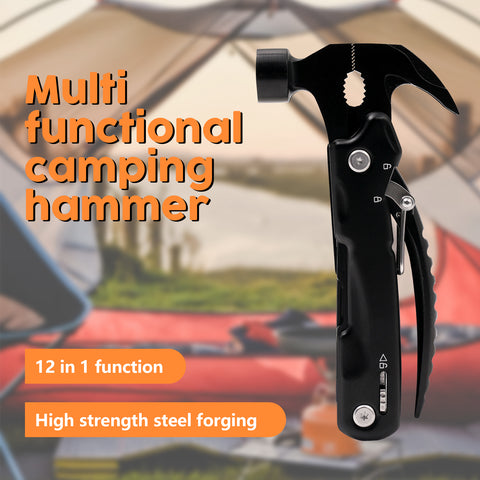 Experience versatility and durability with our Multi-Functional Camping Hammer. Featuring 12 essential tools in one, including pliers, a hammer, and screwdrivers, it's crafted from high-strength steel for exceptional toughness and reliability in any outdoor adventure.