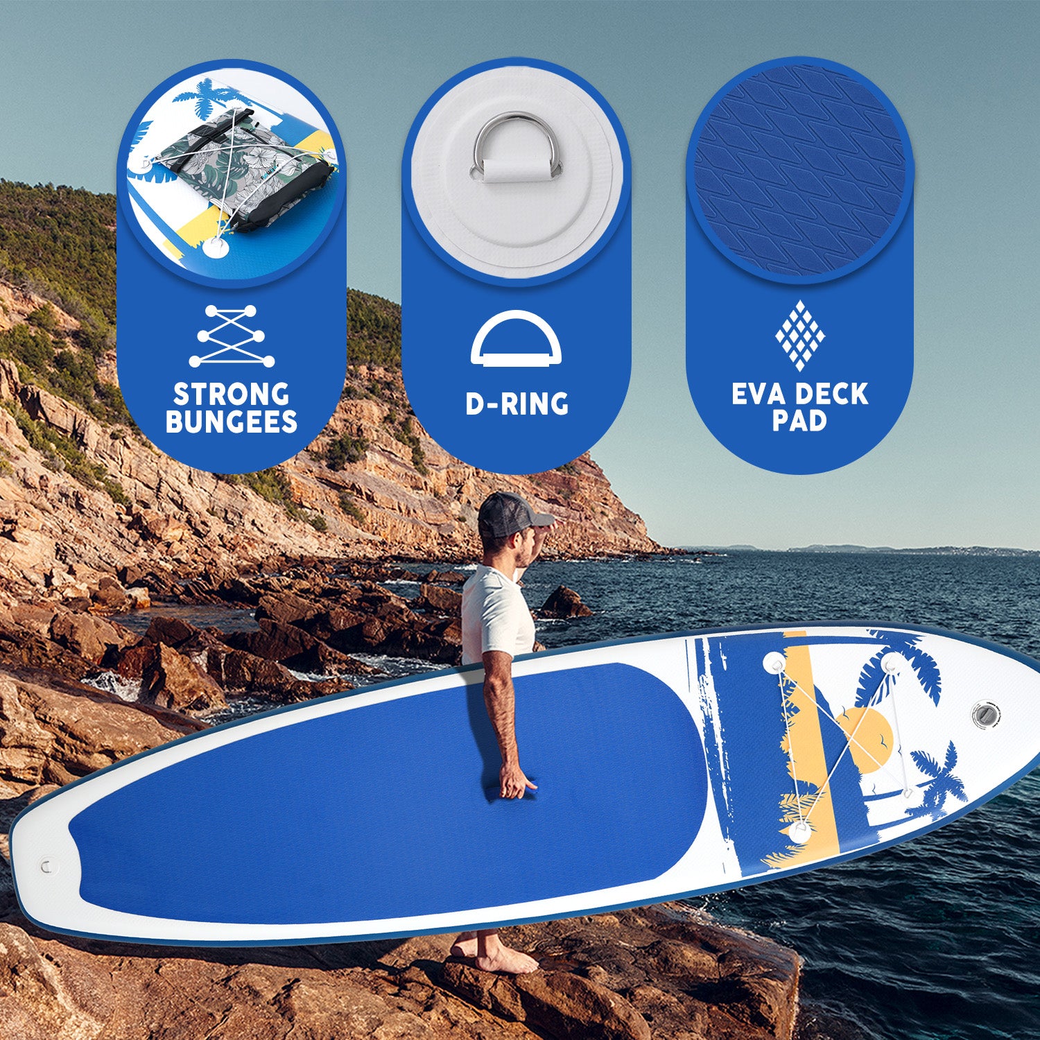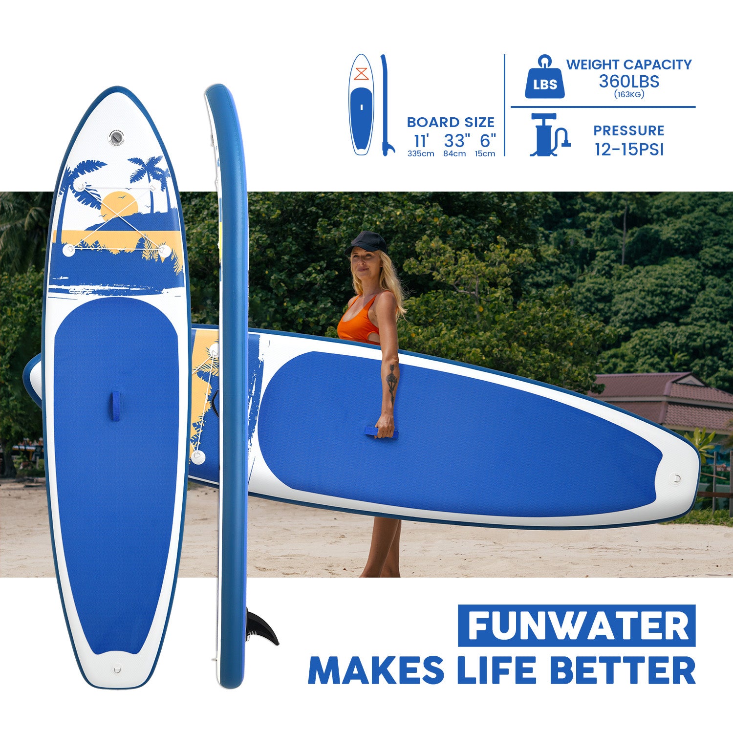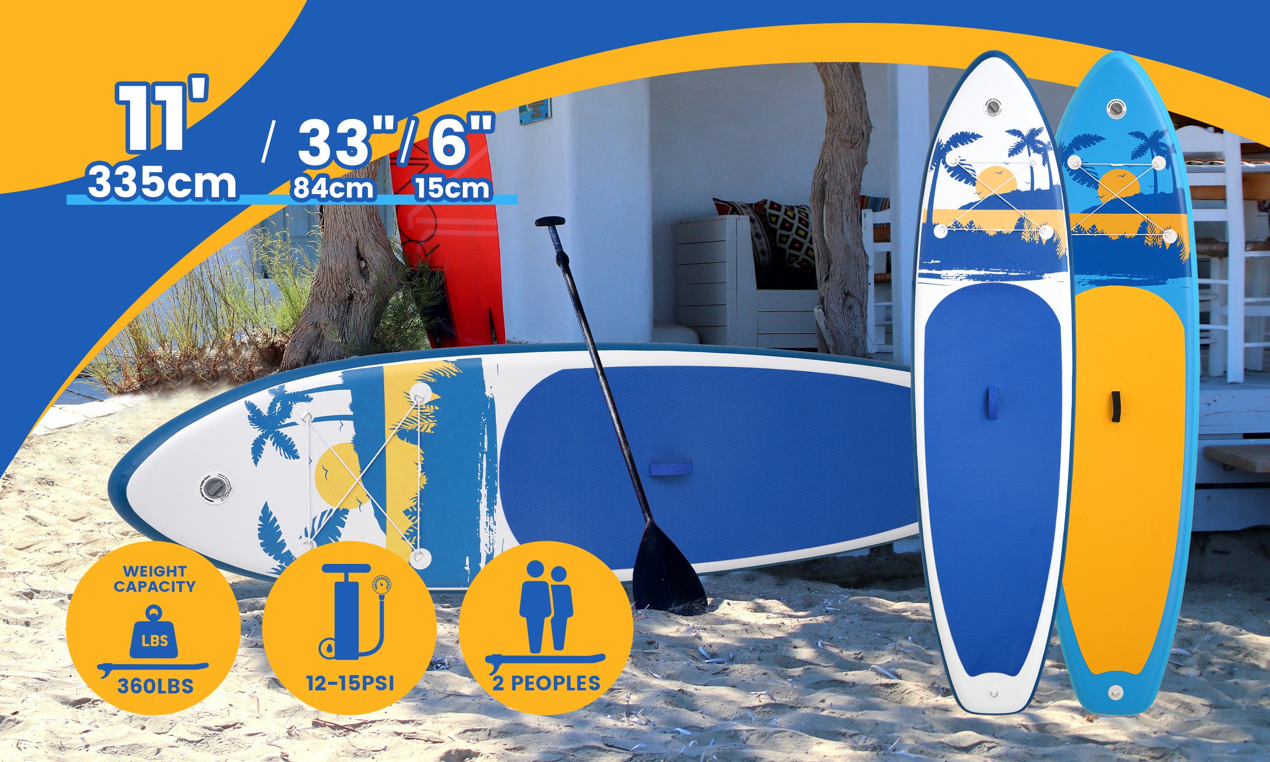 This paddleboard measures 11 feet (335 cm) in length, 33 inches (84 cm) in width, and 6 inches (15 cm) in thickness. It supports a weight capacity of up to 360 lbs (163 kg), making it suitable for two people. Whether you're cruising on calm waters or embarking on an adventurous ride, this paddleboard offers stability and durability for an unforgettable experience.