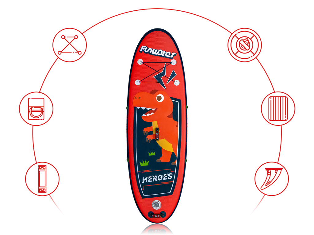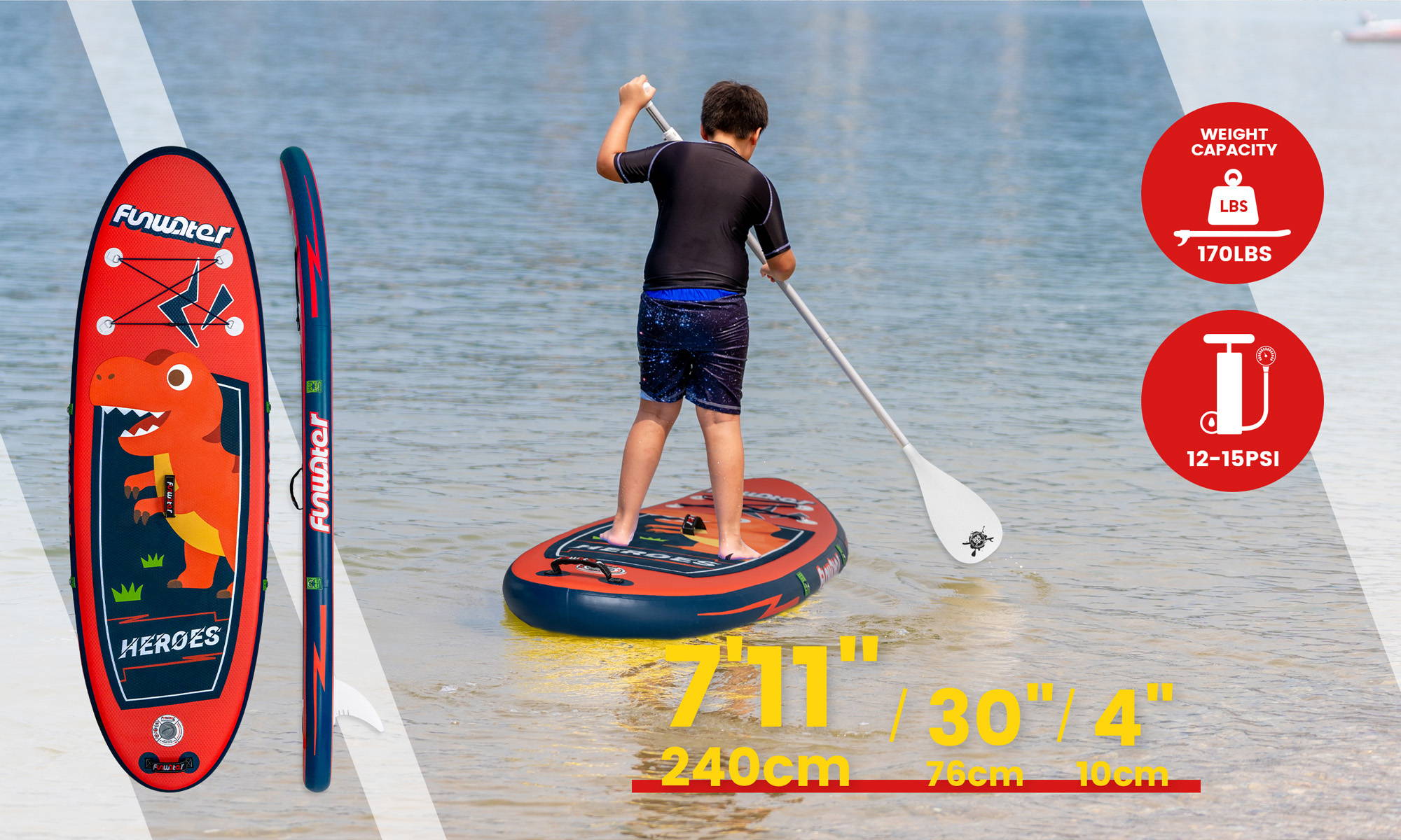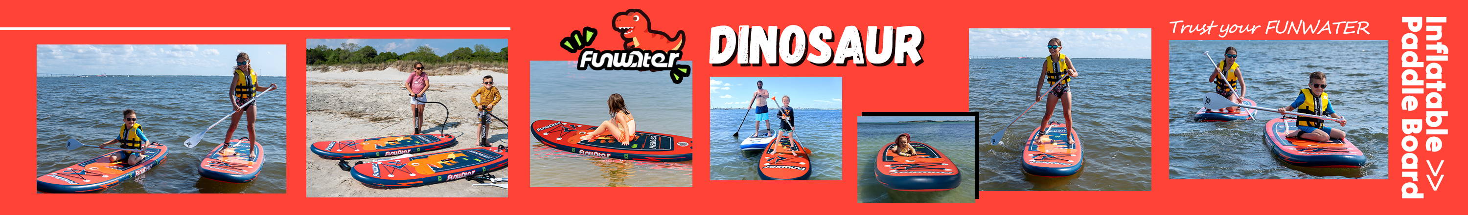 The paddle board's compact size offers easy portability and storage, while the vibrant dinosaur design adds a fun, engaging element to the paddleboarding experience, making it a perfect choice for kids of all skill levels.