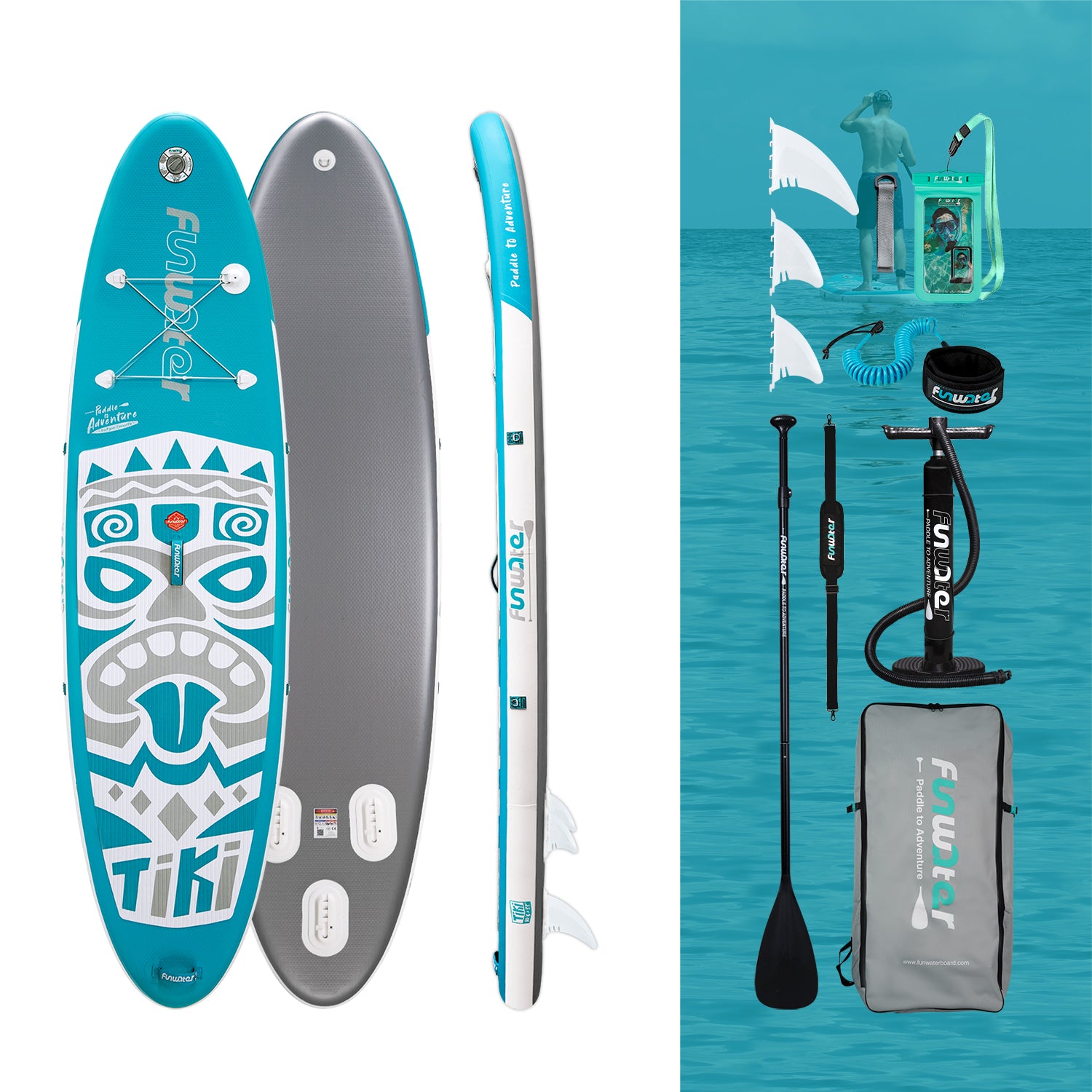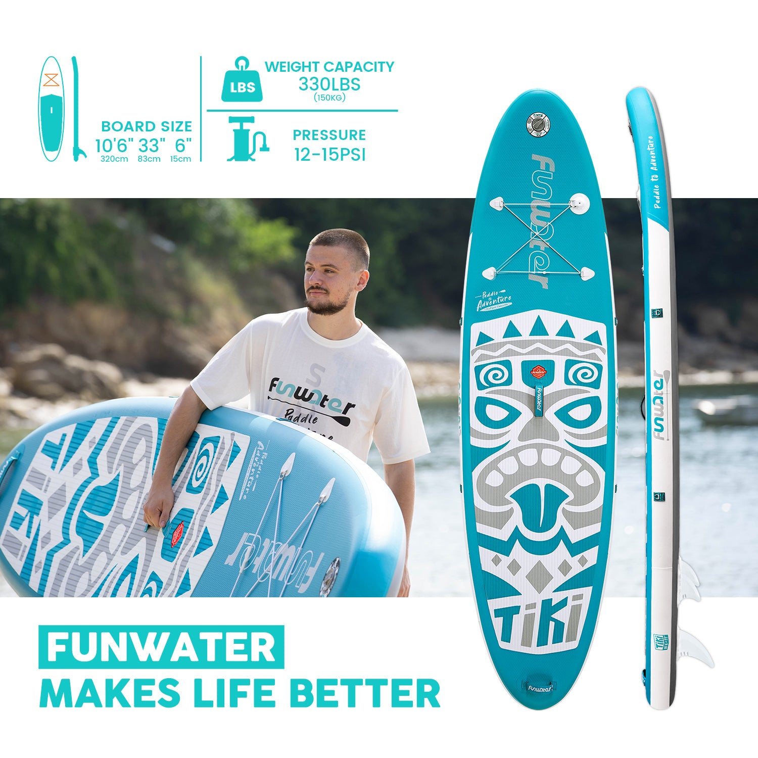 The Funwater NEW TIKI inflatable stand-up paddle board is versatile and suitable for various user scenarios. It can be used for beginners' first paddle experiences, family days at the lake, fitness enthusiasts' workouts, exploring coastal waters, weekend getaways with friends, and dog lovers' paddle adventures.