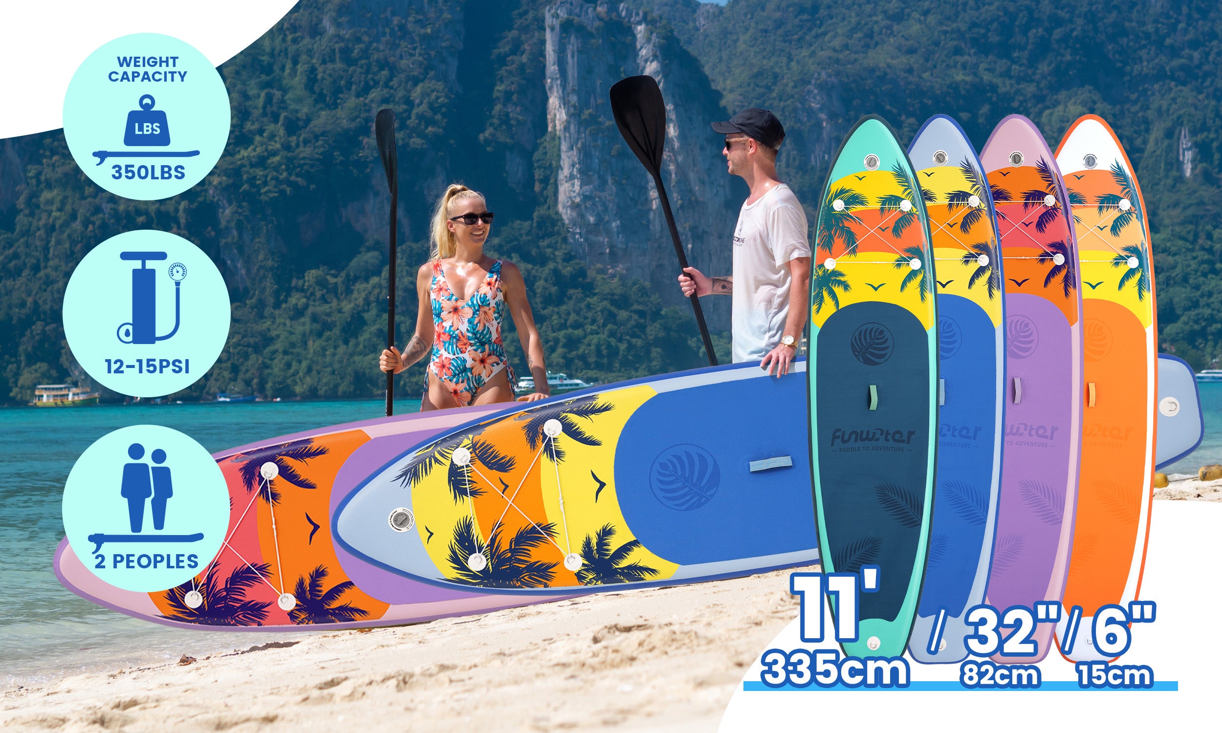 This 11-foot (335 cm) paddleboard is 32 inches (82 cm) wide and 6 inches (15 cm) thick, supporting up to 350 lbs (159 kg) for two people. Inflating to 12-15 PSI, it delivers stability and performance on all water types, perfect for both beginners and seasoned paddlers.